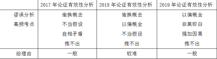 2019年管综中文写作论证有效性分析除了谬误较容易识别之外,理由也相对比较容易想出。识别出材料中比较典型及明显的缺陷,给出有说服力的理由,做到一针见血。再结合相应的写作套路即可取得不错的作文成绩。